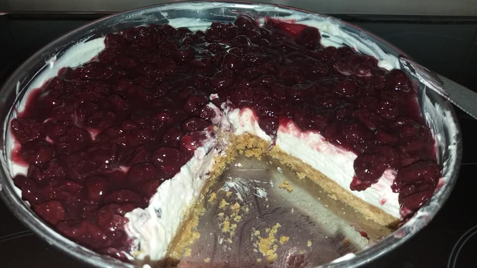 Απλώνουμε την κρέμα πάνω από το μπισκότο και βάζουμε στο ψυγείο. Στραγγίζουμε το ζουμί από την κομπόστα και διαλύουμε εκεί το κορν φλαουρ. Το βάζουμε να πάρει μία βράση για να δέσει και αποσύρουμε από τη φωτιά. Ρίχνουμε μέσα τα βύσσινα. Αφήνουμε την σάλτσα έως ότου γίνει χλιαρή και απλώνουμε πάνω από την κρέμα. Παγώνουμε αρκετές ώρες στο ψυγείο.