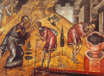 Όπως διαβάζουμε στο Κατά Ιωάννη Ευαγγέλιο (κεφ. 9, 1-38), ο Χριστός, περνώντας μέσα από την Ιερουσαλήμ, συναντάει έναν εκ γενετής τυφλό. Ο Κύριος, έκανε πυλό, αφού έφτυσε στο χώμα, του άλειψε τα μάτια και τον έστειλε στην κολυμβήθρα του Σιλωάμ. Ο τρόπος αυτός θεραπείας, μας υπενθυμίζει τον τρόπο που ο Θεός δημιούργησε τον άνθρωπο, πλάθοντάς τον. Ο Θεός στην Παλαιά Διαθήκη, πλάθει τον άνθρωπο από χώμα, τώρα ο Χριστός, πλάθει τα μάτια του εκ γενετής τυφλού πάλι από χώμα. Ο ίδιος Θεός! Δοκιμάζει την πίστη του τυφλού και τον στέλνει στην κολυμβήθρα του Σιλωάμ. Σέβεται την ελευθερία του ανθρώπου, και ζητάει τη δική του εκούσια και ελεύθερη συμμετοχή του στο θαύμα. Ο τυφλός όμως με πίστη, υπακούει στην εντολή του Θεού, πηγαίνει και πλένεται και επιστρέφει βλέποντας.