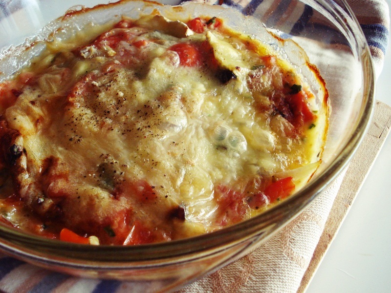 Σε ένα μικρό ταψάκι ή πυρίμαχο σκεύος, βάλε στρώσεις μελιτζάνας και σάλτσας.