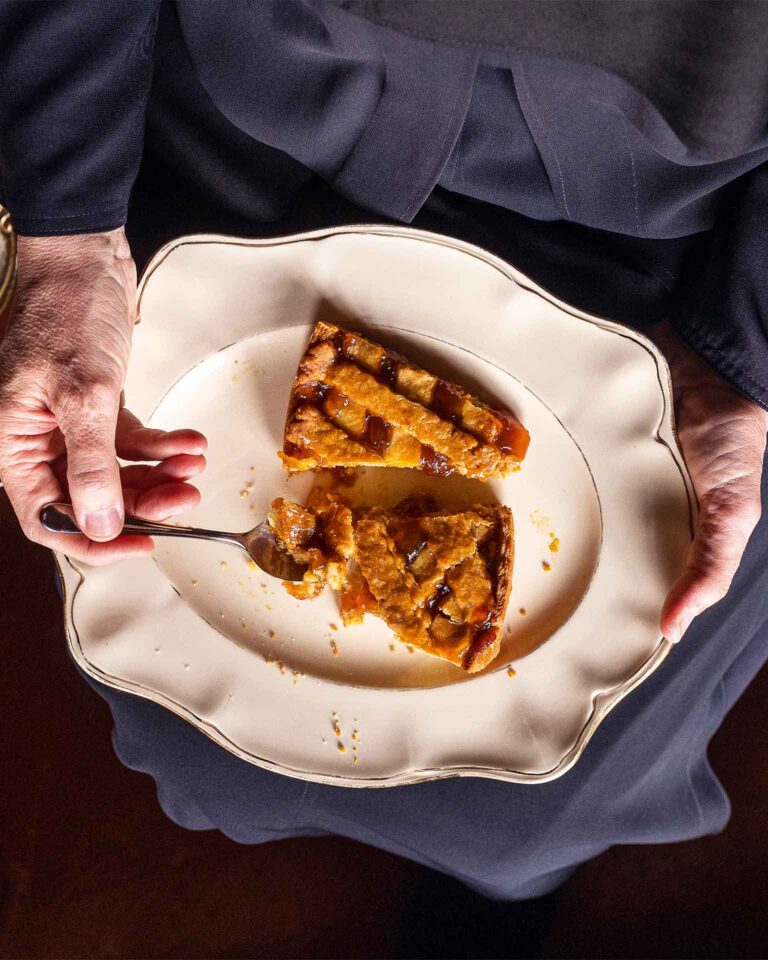 Χωρίζουμε σε μπαλίτσες το δεύτερο κομμάτι ζύμης και τις πλάθουμε σε κορδόνια, τα οποία στρώνουμε χιαστί σαν δίχτυ πάνω στη μαρμελάδα (στο χαρακτηριστικό σχέδιο της πάστα φλόρα), κολλώντας τις άκρες κάθε κορδονιού στη ζύμη στην περιφέρεια της τάρτας.