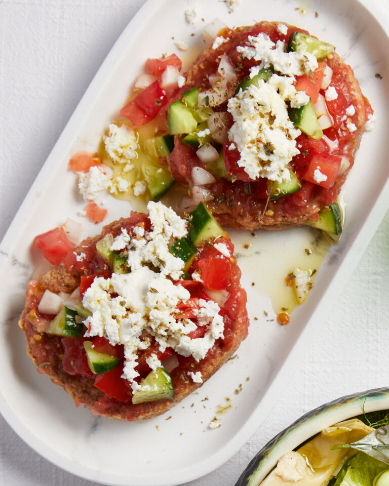 Για να ετοιμάσουμε τον ντάκο βάζουμε την τριμμένη ντομάτα σε μπολ και ρίχνουμε τις κουκουβάγιες. Ανακατεύουμε ώστε να μουλιάσουν από την ντομάτα και να μαλακώσουν ελαφρώς.