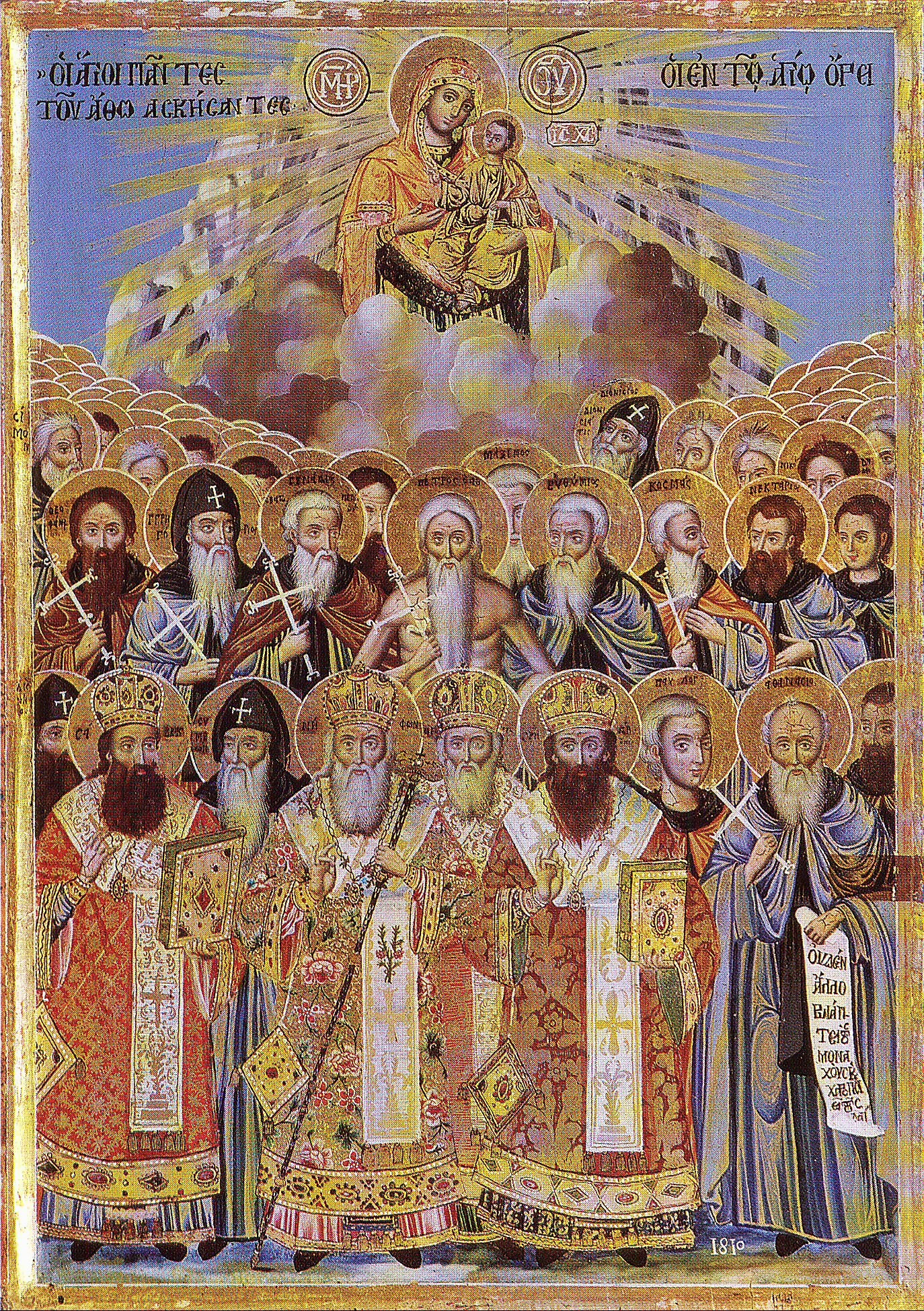 Τοὺς οὐρανώσαντας τὸ Ὄρος Πατέρας, καὶ ὑποδείξαντας ἐν τούτῳ τὸν βίον, Ἀγγέλων πολιτεύεσθαι, καὶ πλήθη μοναχῶν, ἐν αὐτῷ συνάξαντας, ἀνευφημήσωμεν πάντες, πρὸς αὐτοὺς κραυγάζοντες· ἀπὸ πάσης ἀνάγκης, καὶ ἐπηρείας ῥύσασθε ἡμᾶς, πληθὺς Ὁσίων τοῦ Ἄθω τὸ καύχημα.