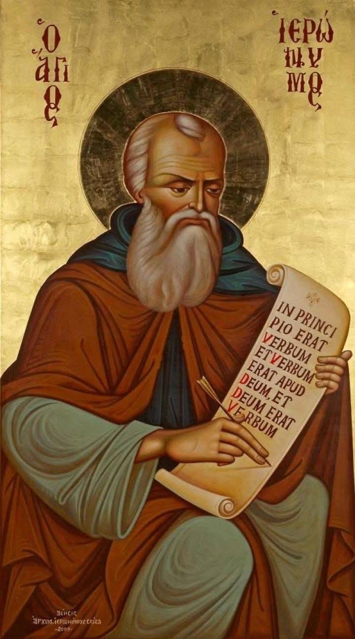 Θείου Πνεύματος, τῇ ἐπιπνοίᾳ, γλῶσσαν ἔνθεον, καταπλουτήσας, μυστογράφος ἐδείχθης τῆς χάριτος, τὴν τῶν Γραφῶν σαφηνίζων ἀκρίβειαν, καὶ ἀρετῶν ἀναπτύσσων τὴν ἔλλαμψιν ὅθεν πρέσβευε, θεόσοφε Ἱερώνυμε, δωρήσασθαι ἡμῖν τὸ μέγα ἔλεος.