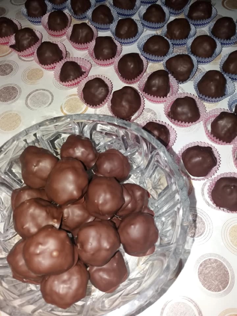 Κάνουμε μπαλάκια, τα περνάμε από τη λιωμένη κουβερτούρα και τα αφήνουμε να παγώσει η σοκολάτα.