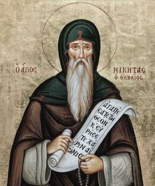 Ἑκ παιδός τῷ Κυρίῳ ῆκολούθησας Ὃσιε, διά προσευχῆς, ἀγρυπνίας καί παντοίας ἀσκῆσεως, τηρῶν αὐτοῦ προθῦμως ἐντολάς, διό καὶ θεῖον Σχῆμα εἰληφώς, τῷ φωτί περιελούεσο αισθητῶς, Θεόδωρός σε ὡς εἶδε. Δόξα τῷ σε δοξάσαντι Χριστῷ, δόκα τῷ τε θαυμαστώσαντι, δόκα Νικήτα ἐκ Θηβῶν, τῷ σε πρέσβυν θεῖον δείξαντι.