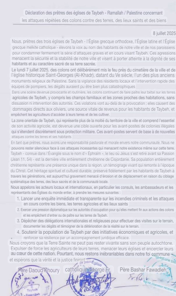 ‘‘Εμείς οι ιερείς των 3 Εκκλησιών της Ταιμπέχ Ελληνορθόδοξης, Λατίνων και Μελκιτών υψώνουμε φωνή στο όνομα των κατοίκων της πόλης και των ενοριτών για να καταδικάσουμε απερίφραστα το σερί των σοβαρών επιθέσεων όσο κι αυτών που είναι σ΄εξέλιξη κατά της Ταιμπέχ. Αυτές οι επιθέσεις απειλούν την ασφάλεια και σταθερότητα της πόλης μας κι επιχειρούν να πλήξουν την αξιοπρέπεια των κατοίκων της και τον ιερό χαρακτήρα της ιερής γης της. Tη Δευτέρα 7.7.2025 οι έποικοι έβαλαν σκοπίμως φωτιά κοντά στο κοιμητήριο και στον ιστορικό ναό του Αγίου Γεωργίου Al Khandr που χρονολογείται από τον 5ο αιώνα , ένα από τα πιο αρχαία θρησκευτικά μνημεία της Παλαιστίνης. Χωρίς την επαγρύπνηση των ντόπιων και την έγκαιρη επέμβαση των πυροσβεστών οι υλικές ζημιές θα ήταν πολύ πιο καταστροφικές..”