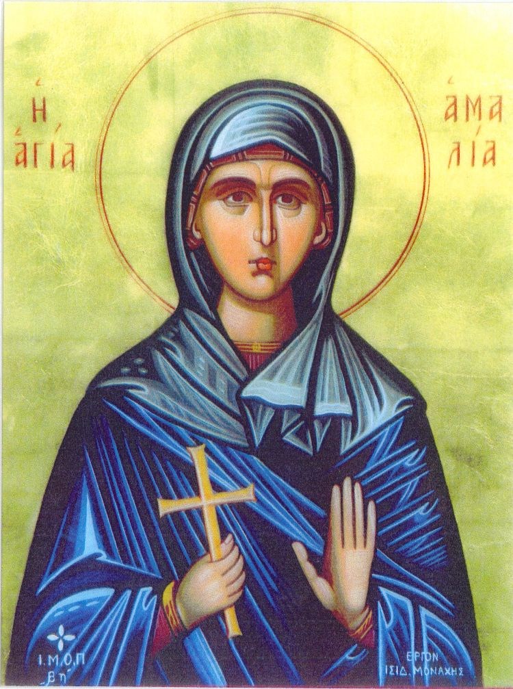 Αμαλίαν οσίαν δεύτε τιμήσωμεν ότι δόξα ανθρώπων καταφρονήσαντα και τον νυμφίο της Χριστό ακολουθήσασα μοναζουσών καλλονή ανεδείχθης ηρωΐς ασκήσεως και αγώνων, διό μη παύσεις πρευβεύων ελεηθήναι τας ψυχάς ημών.