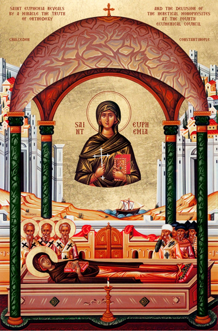 Κατά την ήμερα αυτή, γίνεται ανάμνηση του θαύματος που έγινε από την αγία Ευφημία, όταν, κατά την εποχή του Μαρκιανού και της Πουλχερίας, συντάχθηκαν δύο τόμοι που περιείχαν τον όρο της Συνόδου, που έγινε στη Χαλκηδόνα (451 μ.Χ.) και ήταν ένας των ορθοδόξων και ένας των Μονοφυσιτών. Για να πάψει λοιπόν η έριδα μεταξύ των δύο πλευρών, αποφασίστηκε να τεθούν και οι δύο τόμοι μέσα στη λάρνακα της αγίας Ευφημίας, για να φανεί ποιόν από τους δύο θα δεχτεί η Αγία. Μετά την αποσφράγιση της λάρνακας, βρέθηκε ο μεν των αιρετικών τόμος στα πόδια της Αγίας πεταμένος, ο δε των ορθοδόξων στο στήθος της.