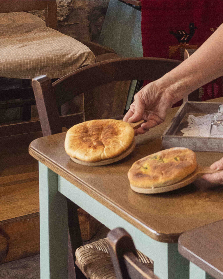 Σε ελαφρά αλευρωμένο ξύλο κοπής πιέζουμε την μπαλίτσα με την παλάμη μας μέχρι να γίνει ένα σχετικά λεπτό δισκάκι με διάμετρο περίπου 15 εκ. Το αλείφουμε με λίγο ελαιόλαδο.