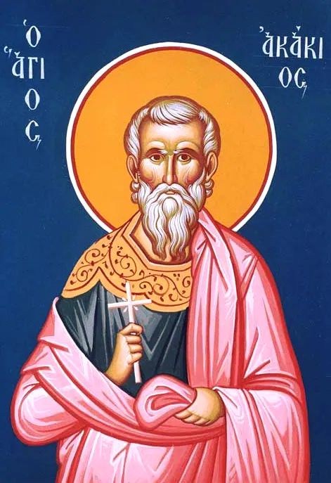 Ο Άγιος Ακάκιος, καταγόταν από την Απολλωνία και μαρτύρησε στα χρόνια του βασιλιά Λικίνιου. Ήταν ένθερμος υποστηρικτής του Ευαγγελίου και δεινός κήρυκάς του. Λόγω του έργου του καταγγέλθηκε και βασανίστηκε. όμως με τη θεία επέμβαση, βγήκε αλάβωτος από τα βασανιστήρια. Έτσι δεν έπαθε τίποτα όταν τον έριξαν μέσα σε καζάνι με βραστό νερό και διασώθηκε από την αγριότητα πεινασμένου λιονταριού. Βλέποντας αυτά τα θαύματα ο έπαρχος Τερέντιος, τον άφησε ελεύθερο.