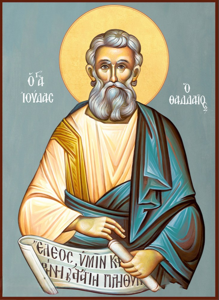 Ἀπόστολε ἅγιε Θαδδαῖε, πρέσβευε τῷ ἐλεήμονι Θεῷ ἵνα πταισμάτων ἄφεσιν, παράσχῃ ταῖς ψυχαῖς ἡμῶν.