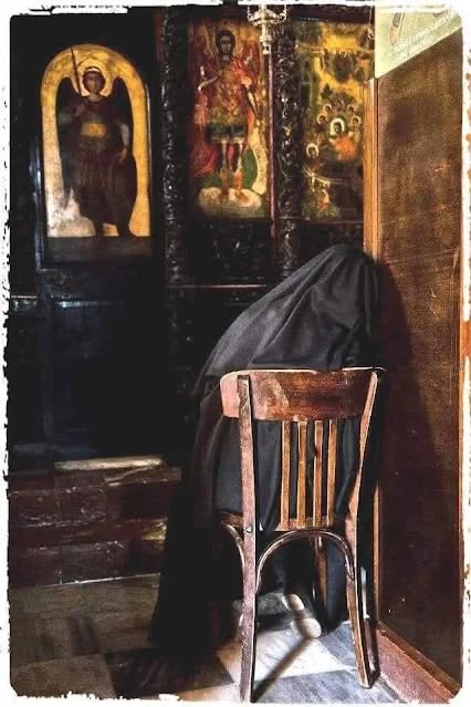 Στο στασίδι το λειασμένο, ορθός, αναμένων, επαναλαμβάνων, γυρτός, μόνος, μοναχός, θεωρών αθορύβως την πλεύση του βίου του θορυβώδους, που κινδύνευσε πολλάκις, που διεσώθη θαυματουργικώς, που επείσθη βεβαίως, αλλά δεν παρεδόθη εισέτι ολοκληρωτικώς τώ Παντάνακτι Αλλ΄όμως “καθ΄ εκάστην εσπέραν ευλογήσω σε, καί αινέσω το όνομά Σου εις τον αιώνα του αιώνος”.