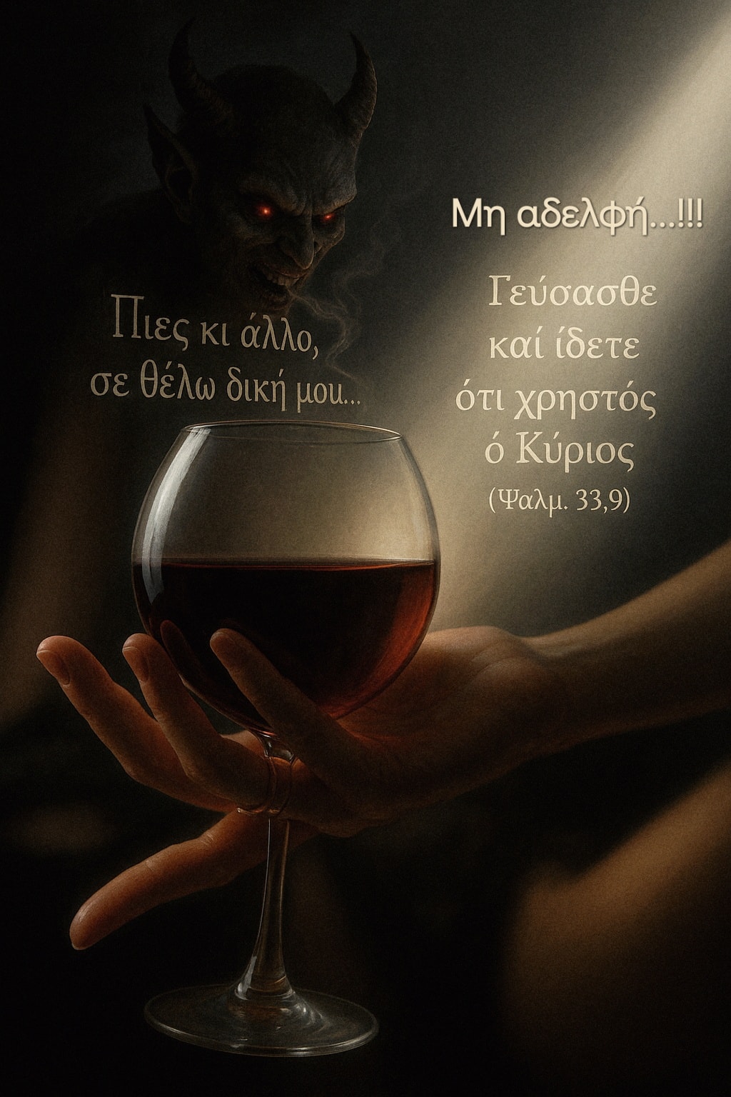 Δεν υπάρχει «σωστή» δόση δηλητηρίου· δεν υπάρχει «λίγο». Υπάρχει μόνο δηλητήριο. Και κάθε φορά που λες «ναι» στο ποτό, λες «όχι» στη ζωή. Ο Θεός μάς δείχνει έναν άλλο δρόμο: «Είναι καλό να μη φας κρέας και να μη πιεις κρασί και να μη κάνεις τίποτε που σκανδαλίζει τον αδελφό σου» (Ρωμαίους 14,21). Ο χριστιανός δεν είναι δούλος του ποτηριού, αλλά δούλος του Χριστού, που τον ελευθέρωσε με το αίμα Του.
