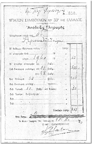 Ἀπόδειξις πληρωμῆς τοῦ Πατρ. Ἀθηναγόρου (Ἀριστοκλῆ Σπύρου) διά τήν λῆψιν τοῦ 33ου Μασωνικοῦ βαθμοῦ