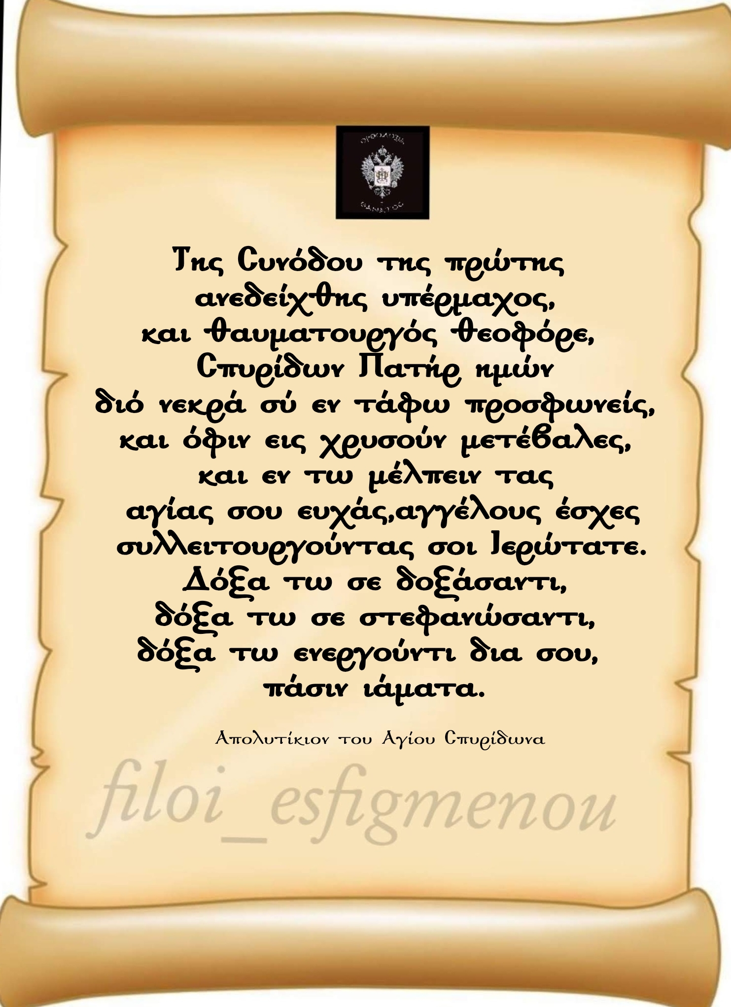 «Σε εξ αλόγου ποίμνης μετήγαγεν εις λογικήν το Πνεύμα, πνευματοφόρε, ως τον Mωσέα και Δαυίδ ων εμιμήσω το πράον, Σπυρίδων, φως οικουμένης».