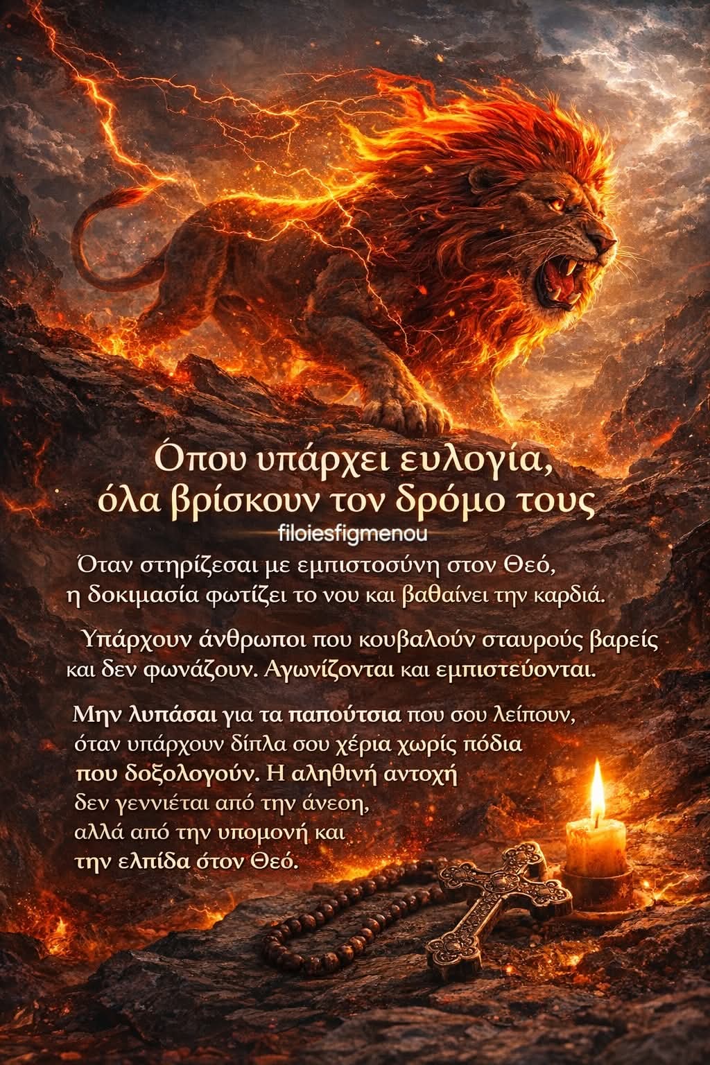 Η εικόνα της δύναμης που προχωρεί χωρίς να δειλιάζει δεν μιλά για αλαζονεία ή επίδειξη. Μιλά για εσωτερική βεβαιότητα. Για την ψυχή που δεν υποχωρεί μπροστά στη δοκιμασία, όχι επειδή δεν πονά, αλλά επειδή γνωρίζει σε Ποιον ανήκει. Αυτή η στάση δεν γεννιέται από χαρακτήρα σκληρό, αλλά από πίστη καλλιεργημένη μέσα στον χρόνο, από προσευχή, από ταπείνωση και εμπιστοσύνη στο θέλημα του Θεού.