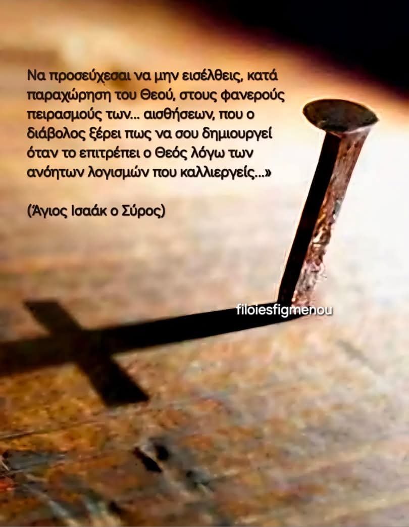 Να προσεύχεσαι να μην εισέλθεις, κατά παραχώρηση του Θεού, στους φανερούς πειρασμούς των… αισθήσεων, που ο διάβολος ξέρει πως να σου δημιουργεί όταν το επιτρέπει ο Θεός λόγω των ανόητων λογισμών που καλλιεργείς…»