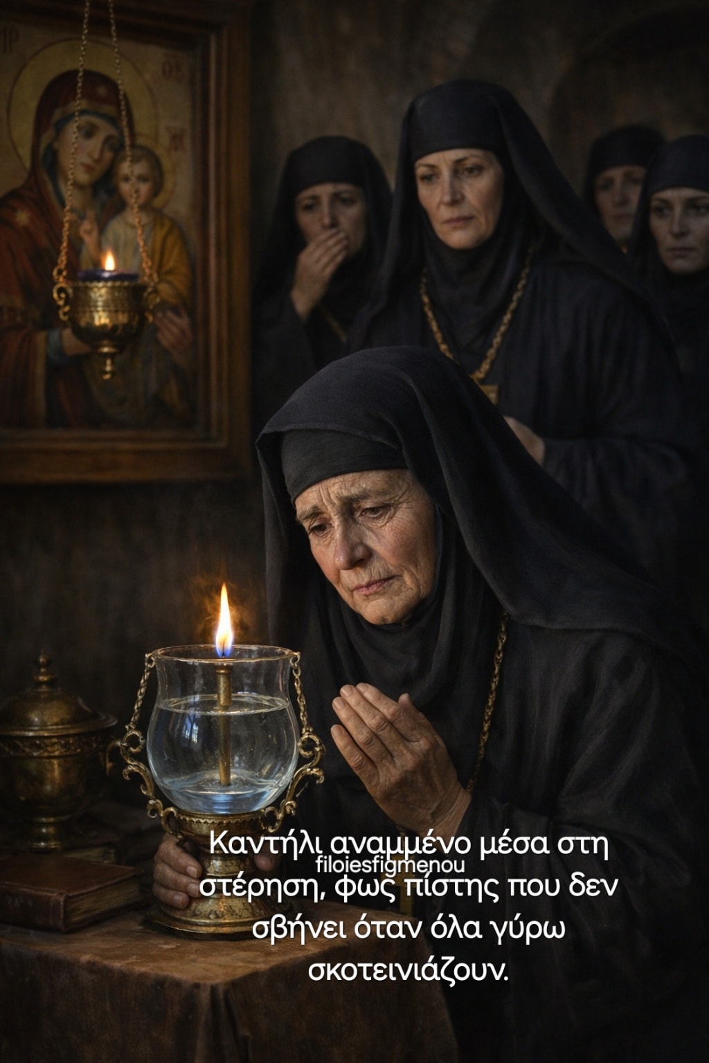 Τότε άναψε φλόγα γαλήνια και σταθερή, πάνω σε καθαρό νερό. Όχι φλόγα θορυβώδη, αλλά ήσυχη, σαν προσευχή που έγινε ορατή. Και το καντήλι της Παναγίας έφεγγε ημέρες πολλές, ενώ όλα τα άλλα στο Καθολικό έμεναν σβηστά. Οι μοναχές απορούσαν, η σιωπή γινόταν ερώτημα. Όταν η Ηγουμένη κάλεσε τη Μακρίνα για να ελέγξει αν υπήρξε ανυπακοή, στάθηκαν μαζί μπροστά στο καντήλι και είδαν το θαύμα. Το φυτίλι έκαιγε πάνω σε καθαρό νερό, χωρίς λάδι.