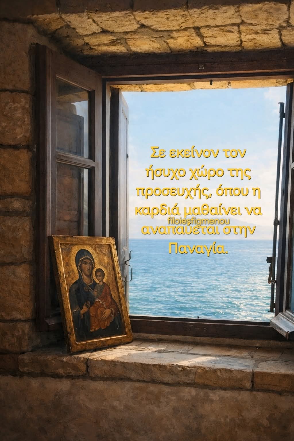 Παναγία μου γλυκιά, Μητέρα του Φωτός, στάσου στο παράθυρο της ψυχής μας όπως στέκεσαι εδώ, ανάμεσα στον κόσμο και στον ουρανό. Πάρε τα κύματά μας και κάν’ τα ειρήνη. Πάρε την κούρασή μας και κάν’ τη ανάπαυση. Φώτισε τον νου μας, μαλάκωσε την καρδιά μας, δίδαξέ μας τη σιωπηλή υπακοή και την ταπεινή αγάπη. Σκέπασε όσους πονάνε, όσους ταξιδεύουν, όσους περιμένουν. Κράτησέ μας κοντά στον Υιό Σου, μέχρι να γίνουν τα δάκρυα φως και οι πληγές δοξολογία. Αμήν