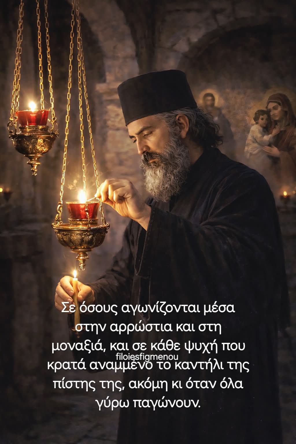 Έβλεπε τους άλλους πατέρες να υψώνουν φωνές στις αγρυπνίες, να βαστούν βαριές νηστείες, να χαρίζουν λόγους που παρηγορούσαν ψυχές. Κι εκείνος, μόνος μπροστά στο εικονοστάσι, ψιθύριζε κάθε βράδυ «Κύριε, εγώ δεν έχω χάρισμα. Μόνο λάδι βάζω και φιτίλια αλλάζω. Είναι αυτό αρκετό για να Σε πλησιάσω;» Θυμόταν τον ψαλμωδό «Κύριος φῶς μου καὶ σωτήρ μου, τίνα φοβηθήσομαι;» μα η καρδιά του ακόμη πάλευε.