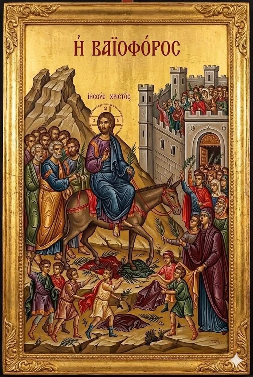 Την ημέρα αυτή γιορτάζουμε την πανηγυρική είσοδο του Κυρίου Ιησού Χριστού στην Ιερουσαλήμ. Τότε, ερχόμενος ο Ιησούς από τη Βηθανία στα Ιεροσόλυμα, έστειλε δύο από τους Μαθητές του και του έφεραν ένα γαϊδουράκι. Και κάθισε πάνω του για να μπει στην πόλη.