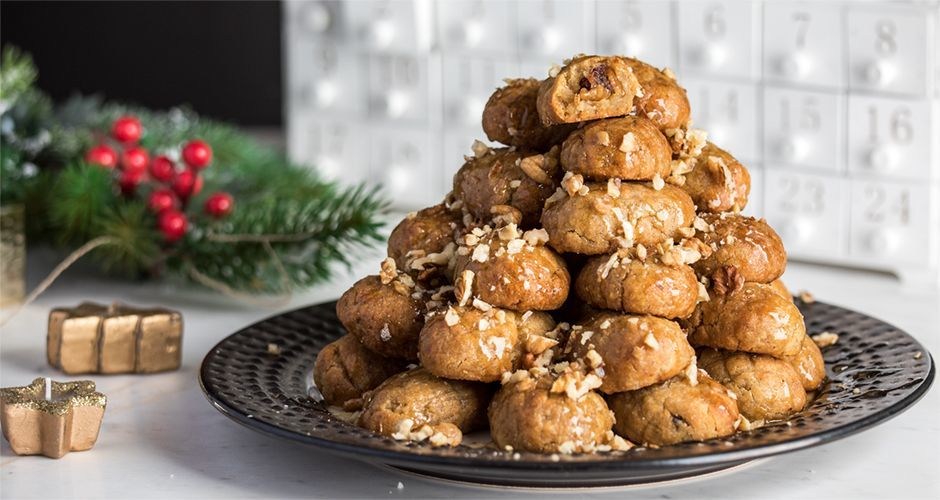 Χτυπάμε το λάδι με τη ζάχαρη.Διαλύουμε τη σόδα και το μπέικιν στο κονιάκ και τη ρίχνουμε στο λάδι με τη ζάχαρη.Προσθέτουμε τα υπόλοιπα υλικά (εκτός από το αλεύρι) και ανακατεύουμε καλά.Ρίχνουμε μετά λίγο-λίγο το αλεύρι (ίσως να μην το πάρει όλο) και ζυμώνουμε,μέχρι που η ζύμη να μην κολλάει στα χέρια μας.Πλάθουμε τα μελομακάρονα, τα αραδιάζουμε σε λαδωμένο ταψί και τα ψήνουμε σε μέτριο φούρνο για μισή ώρα.Ετοιμάζουμε το σιρόπι και το αφήνουμε να κρυώσει.Όταν βγάλουμε τα μελομακάρονα από τον φούρνο , τα βουτάμε στο σιρόπι και τα βάζουμε σε πιατέλα.Από πάνω ρίχνουμε τριμμένη καρυδόψιχα.