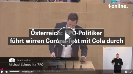 Ένα μέλος του δεξιού λαϊκισμού FPÖ πραγματοποίησε ένα παράλογο πείραμα ζωντανά στο Εθνικό Συμβούλιο της Αυστρίας. Ο Michael Schnedlitz, Γενικός Γραμματέας του FPÖ, χρησιμοποίησε ένα γρήγορο τεστ Corona την Πέμπτη για να δοκιμάσει ένα Cola που είχε φέρει μαζί του. Επειδή η δοκιμαστική ταινία αποχρωματίστηκε, η σκηνή μοιράζεται τώρα θριαμβευτικά από τους κριτικούς των μέτρων Corona.