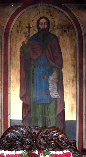 Ἀσκήσει λαμπρυνθεῖς, ὡς χρυσὸς ἐν χωνείᾳ, λαμπρύνεις Μοναστῶν, τοὺς χοροὺς ἑπομένους, τοὶς θείοις σου διδάγμασι, θεοφόρε Λεόντιε, ὅθεν σήμερον, τὴν φωτοφόρον σου μνήμην, ἑορτάζοντες, ὑπὲρ ἠμῶν σὲ πρεσβεύειν, αἰτοῦμεν πρὸς Κύριoν.