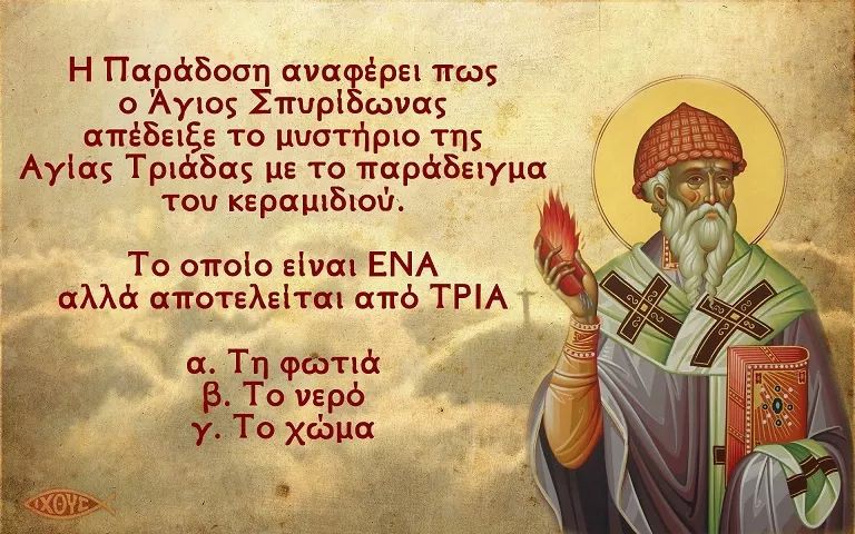 - Αδελφοί και πατέρες μου, συνέχισε ο θαυματουργός• όπως το κεραμίδι αποτελεί ένα πράγμα μιας ουσίας και μιας φύσεως, αλλά είναι τρισύνθετο - φωτιά, νερό, χώμα — έτσι κι ο Άγιος Θεός. Αν και δεν πρέπει να παρομοιάσουμε την Άκτιστο και Υπερούσια αυτή Φύση με κτιστό και φθαρτό δημιούργημα, εν τούτοις για να κάνουμε τα ακατάληπτα καταληπτά, - ας μας συγχωρήσει το άπειρο έλεος Του - λέμε και τονίζουμε: