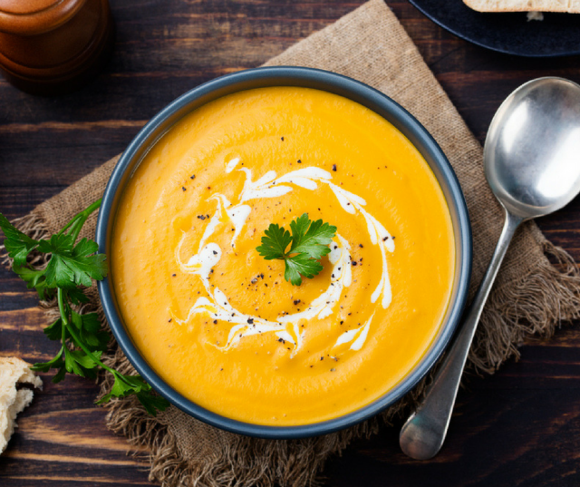 Προσθέτουμε τη γλυκοπατάτα, τα καρότα, το σέλερι και την κόκκινη κολοκύθα κομμένα σε ισομεγέθη κομμάτια και τα αφήνουμε να τσιγαριστούν.