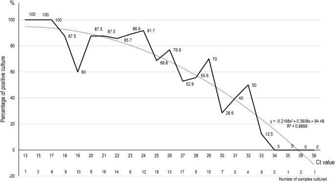 Ποσοστό θετικής ιογενούς καλλιέργειας δειγμάτων ρινοφαρυγγικού θετικού σε SARS-CoV-2 PCR από ασθενείς με Covid-19, σύμφωνα με την τιμή Ct (απλή γραμμή). Η διακεκομμένη καμπύλη υποδεικνύει την καμπύλη πολυωνυμικής παλινδρόμησης.