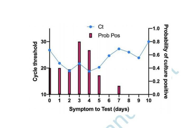 Δύο μελέτες ανέφεραν ότι οι πιθανότητες καλλιέργειας ζωντανών ιών μειώθηκαν κατά περίπου 33% για κάθε μονάδα αύξησης του CT. Έξι από τις οκτώ μελέτες ανέφεραν ανιχνεύσιμο RNA για περισσότερο από 14 ημέρες, αλλά το μολυσματικό δυναμικό μειώθηκε μετά την 8η ημέρα ακόμη και μεταξύ περιπτώσεων με συνεχή υψηλά ιϊκά φορτία… »