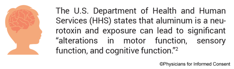 Το Υπουργείο Υγείας και Ανθρωπίνων Υπηρεσιών των ΗΠΑ (HHS) αναγνωρίζει το αλουμίνιο ως γνωστή νευροτοξίνη. [2] Επιπλέον, η FDA έχει προειδοποιήσει για τους κινδύνους της τοξικότητας του αλουμινίου σε βρέφη και παιδιά. [13]