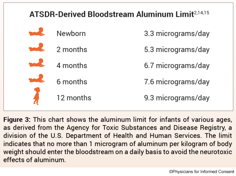 Για τον προσδιορισμό της ποσότητας αλουμινίου που μπορεί να εγχυθεί με ασφάλεια απαιτείται μετατροπή του ορίου ATSDR αλουμινίου λαμβανομένου από το στόμα. Το όριο ATSDR αλουμινίου λαμβανομένου από το στόμα (1.000 μικρογραμμάρια αλουμινίου ανά χιλιόγραμμο σωματικού βάρους ανά ημέρα) βασίζεται στο 0,1% του στοματικού αλουμινίου που απορροφάται στην κυκλοφορία του αίματος, καθώς ο πεπτικός σωλήνας εμποδίζει σχεδόν όλο το στοματικό αλουμίνιο (Εικ. 2α). [2] Σε αντίθεση, το αλουμίνιο λαμβανόμενο μέσω ένεσης ενδομυϊκά παρακάμπτει το πεπτικό σύστημα, και έτσι το 100% του αλουμινίου μπορεί να απορροφηθεί στην κυκλοφορία του αίματος συναρτήσει του χρόνου (δηλαδή, η αναλογία του απορροφημένου αλουμινίου είναι 1.000 φορές μεγαλύτερη). Για να ληφθούν υπόψη αυτές οι διαφορετικές ποσότητες απορρόφησης, το όριο αλουμινίου από το στόμα ATSDR πρέπει να διαιρεθεί με 1.000. Αυτή η μετατροπή έχει ως αποτέλεσμα ενός ATSDR – παραγόμενου ορίου αλουμινίου στη κυκλοφορία του αίματος που προέρχεται από 1 μικρογραμμάριο αλουμινίου (0,1% των 1.000 μικρογραμμάρια) ανά χιλιόγραμμο σωματικού βάρους ανά ημέρα (Εικ. 2β). Στη συνέχεια , για να αποφευχθούν οι νευροτοξικές επιδράσεις του αλουμινίου, όχι περισσότερο από 1 μικρογραμμάριο αλουμινίου ανά χιλιόγραμμο σωματικού βάρους πρέπει να εισέρχεται στην κυκλοφορία του αίματος σε καθημερινή βάση. Το σχήμα 3 δείχνει το όριο αλουμινίου κυκλοφορίας αίματος που προέρχεται από το ATSDR για βρέφη διαφόρων ηλικιών με βάση το βάρος τους.