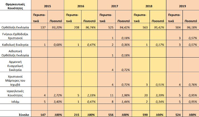 · Τρία (3) περιστατικά αφορούν στους Γνησίους Ορθοδόξους Χριστιανούς (Γ.Ο.Χ.), ήτοι το 0,5% επί του συνόλου,