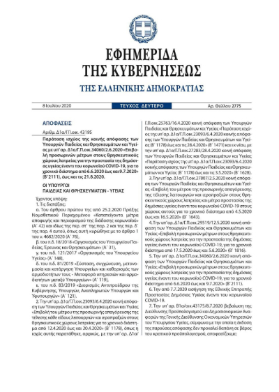 Η ισχύς της υπ’ αρ. Δ1α/Γ.Π.οικ.34060/2.6.2020 κοινής απόφασης των Υπουργών Παιδείας και Θρησκευμάτων και Υγείας «Επιβολή προσωρινών μέτρων στους θρησκευτικούς χώρους λατρείας για την προστασία της δημόσιας υγείας έναντι του κορωνοϊού COVID-19, για το χρονικό διάστημα από 6.6.2020 έως και 9.7.2020» (Β’ 2111), παρατείνεται από τη λήξη της έως και τις 21.8.2020.