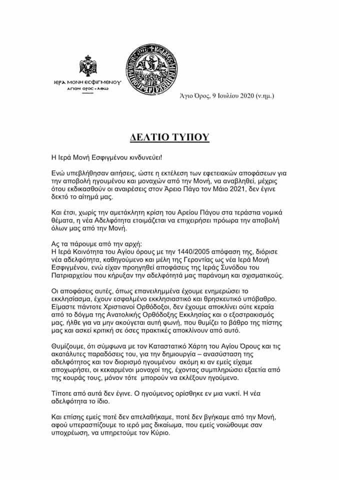 Ενώ υπεβλήθησαν αιτήσεις, ώστε η εκτέλεση των εφετειακών αποφάσεων για την αποβολή ηγουμένου και μοναχών από την Μονή, να αναβληθεί, μέχρις ότου εκδικασθούν οι αναιρέσεις στον Άρειο Πάγο τον Μάιο 2021, δεν έγινε δεκτό το αίτημα μας.