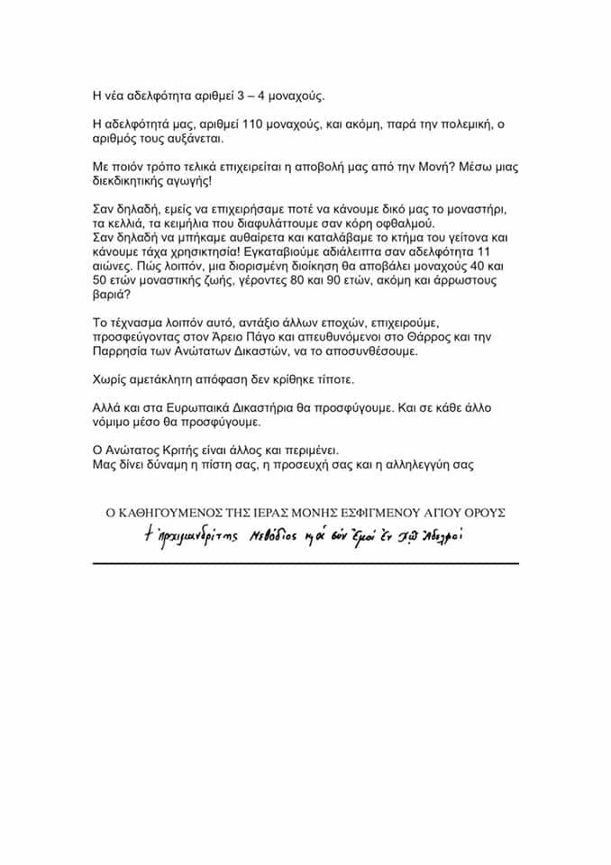 Σαν δηλαδή να μπήκαμε αυθαίρετα και καταλάβαμε το κτήμα του γείτονα και κάνουμε τάχα χρησικτησία! Εγκαταβιούμε αδιάλειπτα σαν αδελφότητα 11 αιώνες. Πώς λοιπόν, μια διορισμένη διοίκηση θα αποβάλει μοναχούς 40 και 50 ετών μοναστικής ζωής, γέροντες 80 και 90 ετών, ακόμη και άρρωστους βαριά?