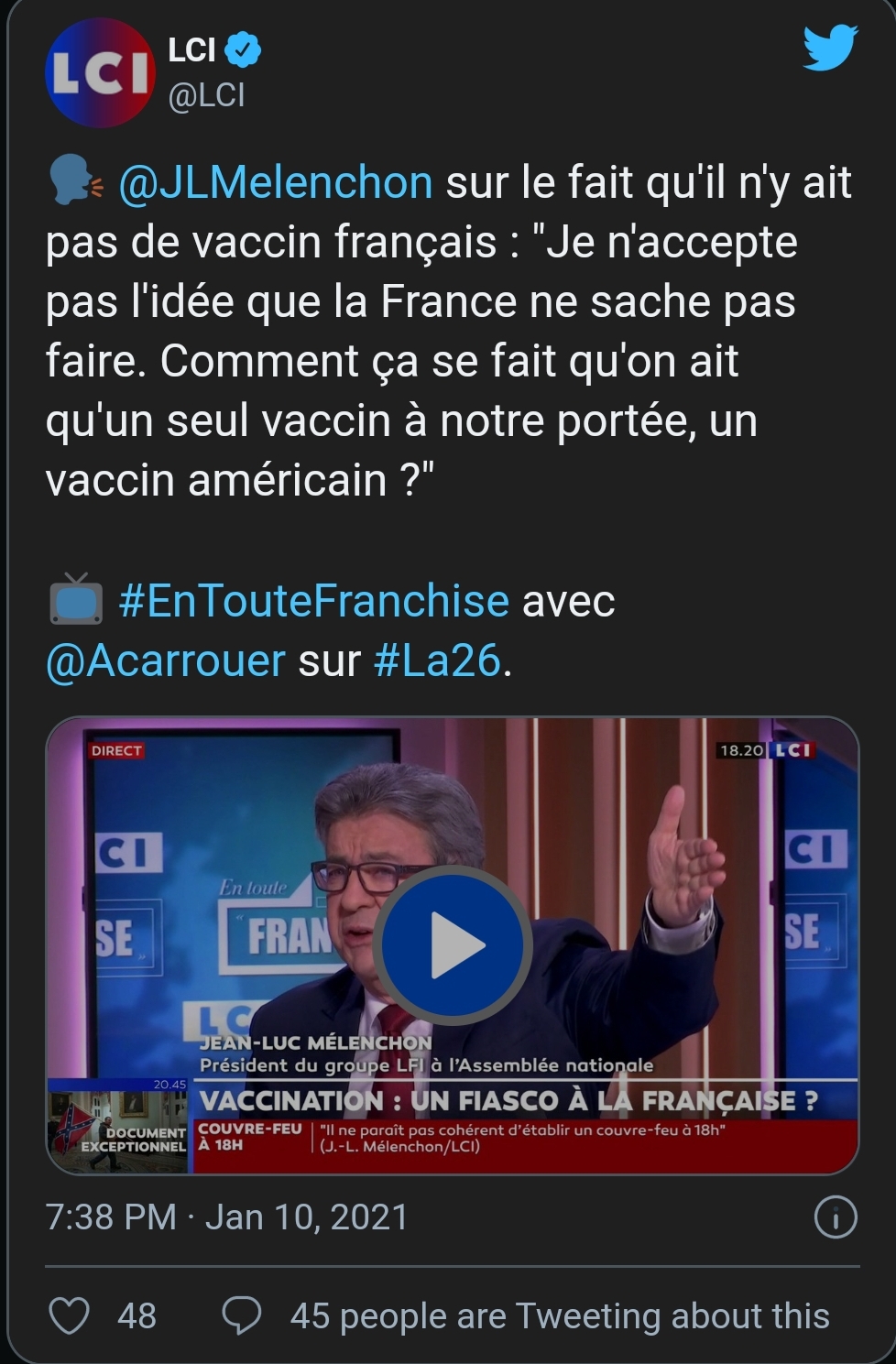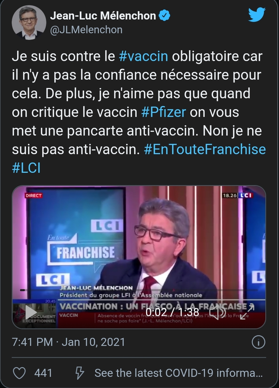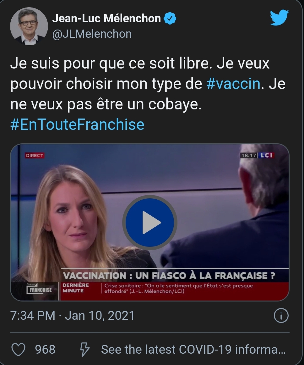 Ο αρχηγός της Γαλλικής Αριστεράς, και μάλιστα της Ριζοσπαστικής, του κόμματος La France insoumise (FI, Ανυπότακτη Γαλλία) ο Ζαν-Λυκ Μελανσόν που στις τελευταίες προεδρικές εκλογές για 1% έχασε την προνομιούχα δεύτερη θέση που θα τον οδηγούσε στον β΄γύρο κατά Μακρόν μίλησε σχετικά με τα εμβόλια την Κυριακή 10 Ιανουαρίου 2021 στο plateau της τηλεόρασης του LCI.Χαρακτήρισε ούτε λίγο ούτε πολύ τα ”εμβόλια” ως μη εμβόλια.Σαρκάζει ”πήγα σχολείο και ξέρω τι είναι ένα εμβόλιο”. Δήλωσε μη πεπεισμένος γιατί χρησιμοποιείται μια διαδικασία εντελώς νέα που δεν ξέρουμε τις συνέπειες.Θα επιλέξει αν είναι να εμβολιαστεί παραδοσιακά εμβόλια και όπως είπε χαρακτηριστικά ”Θέλω να είμαι σε θέση να επιλέξω […] και να μην είμαι ινδικό χοιρίδιο “.Δηλαδή το είπε χοντρά χρησιμοποιούν τους ανθρώπους ως πειραματόζωα.