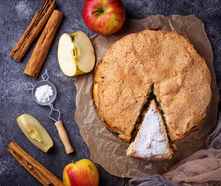Βάζουμε σε ένα σκεύος τους κρόκους, τη ζάχαρη, το ξύσμα του πορτοκαλιού και τη βανίλια και τα χτυπάμε καλά μέχρι να ασπρίσει το μείγμα. Ρίχνουμε σταδιακά το χυμό του πορτοκαλιού και ανακατεύουμε. Σε ένα άλλο μπολ χτυπάμε τα ασπράδια με το αλάτι και λίγη ζάχαρη, μέχρι να γίνουν μαρέγκα. Χρειάζεται αρκετή ώρα, ώστε η μαρέγκα μας να γίνει σφιχτή και σταθερή. Ενώνουμε τα δύο υλικά και τα ανακατεύουμε με απαλές κινήσεις με ένα κουτάλι, ώστε να μην φύγει ο αέρας από την μαρέγκα. Προσθέτουμε το αλεύρι και το μπέικιν και ανακατεύουμε. Βουτυρώνουμε πάρα πολύ καλά ένα ταψί. Καθαρίζουμε τα μήλα, από τις φλούδες και τα κουκούτσια και τα κόβουμε σε λεπτές φέτες. Στρώνουμε τον πάτο του ταψιού με τις φέτες και φροντίζουμε να γεμίσει καλά. Πασπαλίζουμε με λίγη σκόνη κανέλας και ρίχνουμε λίγη μαρμελάδα σε κάποια σημεία με ένα κουταλάκι του γλυκού. Ρίχνουμε το μείγμα και ψήνουμε σε προθερμασμένο φούρνο στους 160 βαθμούς για 50 λεπτά στις αντιστάσεις. Όταν ψηθεί, το βγάζουμε το αφήνουμε να κρυώσει και ξεφορμάρουμε, αναποδογυρίζοντας το ταψί σε μια μεγάλη πιατέλα, προσεχτικά. Πασπαλίζουμε με άχνη ζάχαρη αν θέλουμε και τριμμένα καρύδια.