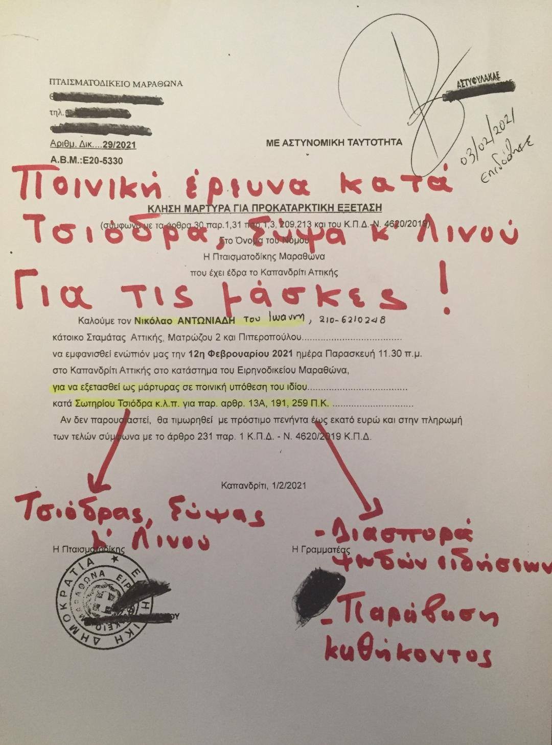 Θα δώσετε με την ιδιότητα των υπόπτων έγγραφες εξηγήσεις για τα εγκλήματα της διασποράς ψευδών ειδήσεων (191 Ποινικού Κώδικα) και της παράβασης καθήκοντος (259 Ποινικού Κώδικα).