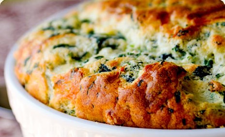 Αδειάζουμε το μίγμα στο πυρίμαχο σκεύος που ετοιμάσαμε και ψήνουμε στο προθερμασμένο φούρνο για 40-45 λεπτά αφού φουσκώσει και ροδίσει στο επάνω μέρος.