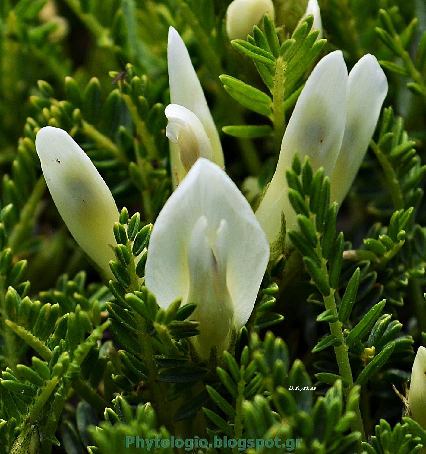 Πολυετής, χαμηλός, προσκεφαλόμορφος θάμνος, με πολλές διακλαδώσεις. Φύλλα μήκους από 2 έως 5 εκατοστά, πτεροσχιδή με 6 ή 7 ζεύγη γραμμοειδών – λογχοειδών τριχωτών φυλλαρίων που καταλήγουν σε αγκάθι. Άνθη 10 έως 12 χιλιοστών ανά ζεύγη, στις μασχάλες των φύλλων. Πέτασος λευκορόδινος, πτερύγια και τρόπιδα σε κίτρινο ανοιχτό χρώμα. Έχει ρίζα υπόλευκη, ινώδη, που αυξάνεται πλαγίως.