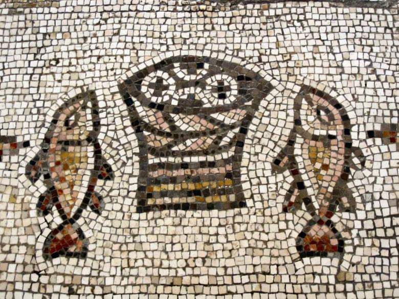 [Οι πέντε άρτοι και οι δύο ιχθύες που πολλαπλασίασε ο Χριστός. Ψηφιδωτό του 5ου αιώνα περίπου, στο δάπεδο κάτω από την Αγία Τράπεζα της παλαιοχριστιανικής βασιλικής στην Tabgha, εκεί όπου είχε γίνει το θαύμα
