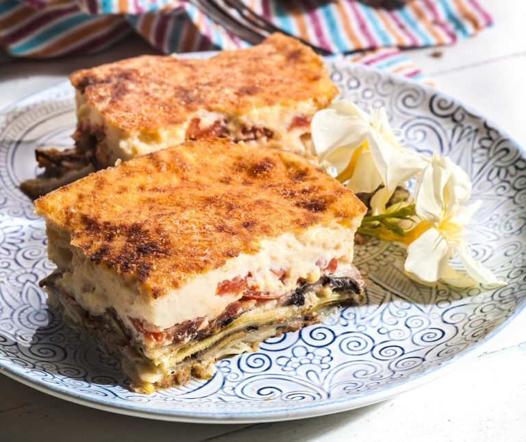Καθαρίζουμε τις πατάτες και τις μελιτζάνες, τις πλένουμε και τις κόβουμε σε φέτες. Στη συνέχεια τοποθετούμε τις μελιτζάνες σε ένα τρυπητό, αφού τις αλατίσουμε επί μία ώρα τουλάχιστον. Κατόπιν τηγανίζουμε πρώτα τις πατάτες και ύστερα τις μελιτζάνες. Καθαρίζουμε τα κρεμμύδια, τα σκόρδα και τα ψιλοκόβουμε. Τα σοτάρουμε σε έναν ταβά και όταν ροδίσουν, προσθέτουμε τις ντομάτες, τις οποίες έχουμε πολτοποιήσει. Αφού βράσουν για 15 λεπτά τα υλικά, ρίχνουμε τα μπαχαρικά και σβήνουμε τη φωτιά. Στη συνέχεια, στρώνουμε μία σειρά πατάτες στο ταψί και ρίχνουμε με μία βαθιά κουτάλα λίγη από τη γέμιση. Προσθέτουμε ύστερα λίγη φρυγανιά και λίγο κεφαλοτύρι. Κατόπιν τοποθετούμε μία σειρά μελιτζάνες. Επαναλαμβάνουμε το ίδιο, δηλαδή πατάτες, γέμιση, φρυγανιά, κεφαλοτύρι, μελιτζάνες, γέμιση, φρυγανιά και κεφαλοτύρι. Κανονίζουμε έτσι ώστε τα υλικά μας να φτάσουν για δύο σειρές πατάτες και δύο σειρές μελιτζάνες και τέσσερις σειρές στρώσεις με φρυγανιά, κεφαλοτύρι και γέμιση.