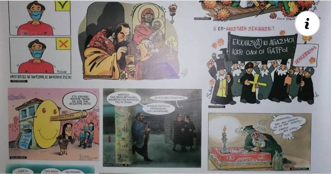 Σοκαριστικά βλάσφημη καί χυδαία «πρόκληση γιά τήν πρόκληση», χωρίς καμία ἄλλη ὁρατή αἰτία. Καμαρῶστε. Ἕνας παπᾶς ἀκουμπάει πάνω σέ μιά ἀπομίμηση Ἁγίας Τράπεζας, τύφλα στό μεθύσι (ἀπό Θεία Κοινωνία), λέγοντας: «Τόση Θεία Κοινωνία καί νά πάει χαμένη; Ἁμαρτία δέν εἶναι; Χίκ»! Πιό δίπλα, ἕνας ἄλλος παπᾶς μέ χυδαία χαρακτηριστικά καί ἀκόμη πιό χυδαία στάση (κάτι μεταξύ πόρνης τοῦ πεζοδρομίου καί πρεζέμπορα), λέει σέ δύο περαστικές γιαγιᾶδες «Κορίτσια, ἔχω ὡραία μεταλαβιά ἀνόθευτη ἀπό κορωνοϊό, πρῶτο πρᾶμα» καί ἐκεῖνες τοῦ ἀπαντοῦν «Σέ Ἅγιο Φῶς παίζει κάτι»; Πιό πάνω ἕνας τρίτος παπᾶς κοινωνάει μιά γριά μέ φόντο μία εἰκόνα τέμπλου, στήν ὁποία ἀπεικονίζονται ἡ Παναγία καί ὁ Χριστός φορώντας φίμωτρο. Λίγο πιό πέρα, μία διαδήλωση κληρικῶν (δίκην ἀντιεξουσιαστῶν) πού κρατοῦν ἕνα Σταυρό σέ στάση πολυβόλου καί φωνάζουν τό σύνθημα «Ἐκκλησία κι ἀγιασμοί, κάτω ὅλοι οἱ γιατροί». Τέρμα κάτω, ἕνας ἀκόμη ἱερέας θυμιάζει σκορπώντας ὁλόγυρά του κορωνοϊό.