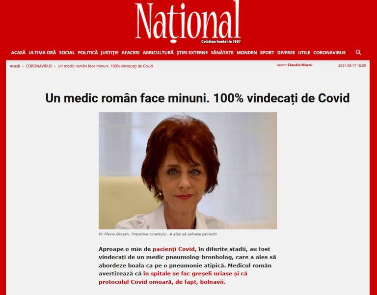«Μια Ρουμάνα Πνευμονολόγος κάνει θαύματα : θεράπευσε 100% τους ασθενείς της με Covid » – Υπό αυτόν τον τίτλο εμφανίστηκε ένα άρθρο μακροσκελές στη ρουμάνικη εφημερίδα Național, που βρίσκεται στα κιόσκια σε όλη τη χώρα. Το μυστικό αυτής της γυναίκας γιατρού της Oradea; Για να θεραπεύσει τους ασθενείς της δεν εφαρμόζει το ιατρικό πρωτόκολλο του οποίου η χρήση έγινε υποχρεωτική σχεδόν παντού.