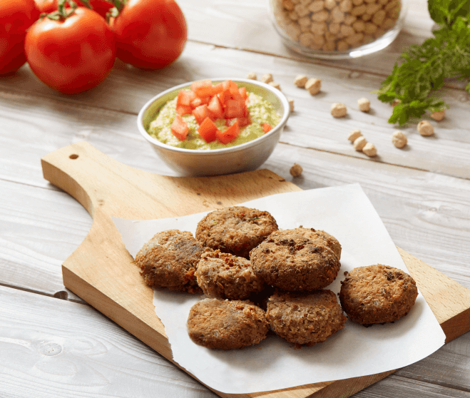 Βάζουμε τα ρεβύθια από το προηγούμενο βράδυ σε μια λεκάνη με άφθονο νερό να φουσκώσουν. Την επόμενη μέρα τα στραγγίζουμε και τα βάζουμε να βράσουν. Καθαρίζουμε τις πατάτες, τις κόβουμε σε κύβους και τις βάζουμε να βράσουν. Αν θέλουμε μπορούμε να τις πλύνουμε κα να τις βάλουμε να βράσουν ολόκληρες, και να τις ξεφλουδίσουμε αργότερα. Έτσι η πατάτα θα κρατήσει πρισσότερο την γεύση της, όμως θα μας πάρει περισσότερο χρόνο. Όταν βράσουν τα ρεβύθια και οι πατάτες, τα στραγγίζουμε και τα βάζουμε σε μια λεκάνη. Τα λιώνουμε με το μίξερ χειρός ή με το ειδικό εργαλείο που λιώνουμε τις πατατές. Όσο είναι ζεστά λιώνουν εύκολα. Αν θέλουμε μπορούμε να τα βάλουμε και στο μίξερ, χωρίς όμως να τα αλέσουμε πολύ, για να μείνουν λίγα κομματάκια από τα όσπρια. Εφόσον τα λιώσουμε, προσθέτουμε, όλα τα υπόλοιπα υλικά, ζυμώνουμε και αφήνουμε για μία ώρα στην άκρη. Αν δούμε ότι η ζύμη είναι αρκετά χαλαρή, μπορούμε να προσθέσουμε λίγο αλεύρι ακόμη, για να απορροφήσει την υγρασία. Ετοιμάζουμε την σως. Χτυπάμε την μουστάρδα και το λεμόνι σε ένα πιάτο και το αφήνουμε στην άκρη. Αλευρώνουμε ελαφρώς τα χέρια μας, πλάθουμε την ζύμη σε μπιφτέκια. Κάθε κομμάτι το βουτάμε λίγο στην μουστάρδα και έπειτα το τυλίγουμε στην τριμμένη φρυγανιά. Τα στρώνουμε σε ταψί που έχουμε βάλει λαδόκολλα και ψήνουμε στους 200 βαθμούς στις αντιστάσεις, μέχρι να ροδίσει η κρούστα. Σερβίρονται ζεστά, αλλά και κρύα είναι το ίδιο νόστιμα. Συνδυάζονται με ρύζι, πουρέ και ψητά λαχανικά.