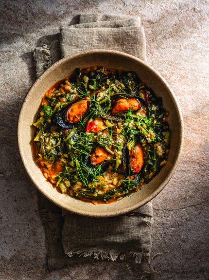 Ανακατεύετε στα χόρτα τα μύδια και αφήνετε για 5 λεπτά να ενωθούν οι γεύσεις. Αποσύρετε το φαγητό από τη φωτιά και το σερβίρετε χλιαρό, πασπαλίζοντας, αν θέλετε με επιπλέον ψιλοκομμένο μάραθο.