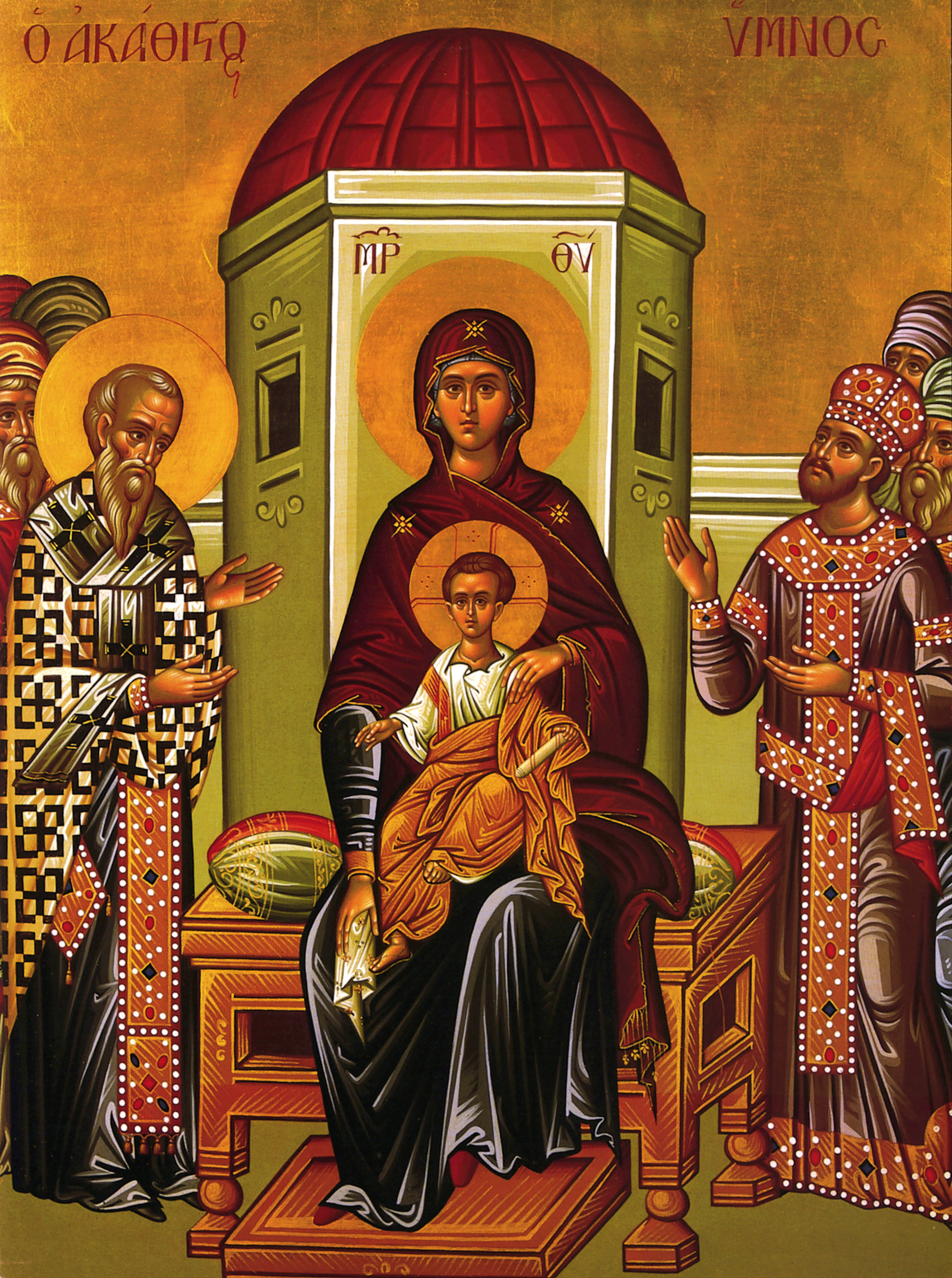 Ὕμνοις ἐν αΰπνοις οἱ εὐσεβεῖς, ἀκαθίστῳ στάσει, ἀνυμνοῦμεν πανευλαβῶς, τὴν πρὸς τὸν λαόν σου, θερμήν σου προστασίαν, Παρθένε Θεοτόκε, ἡμῶν βοήθεια.